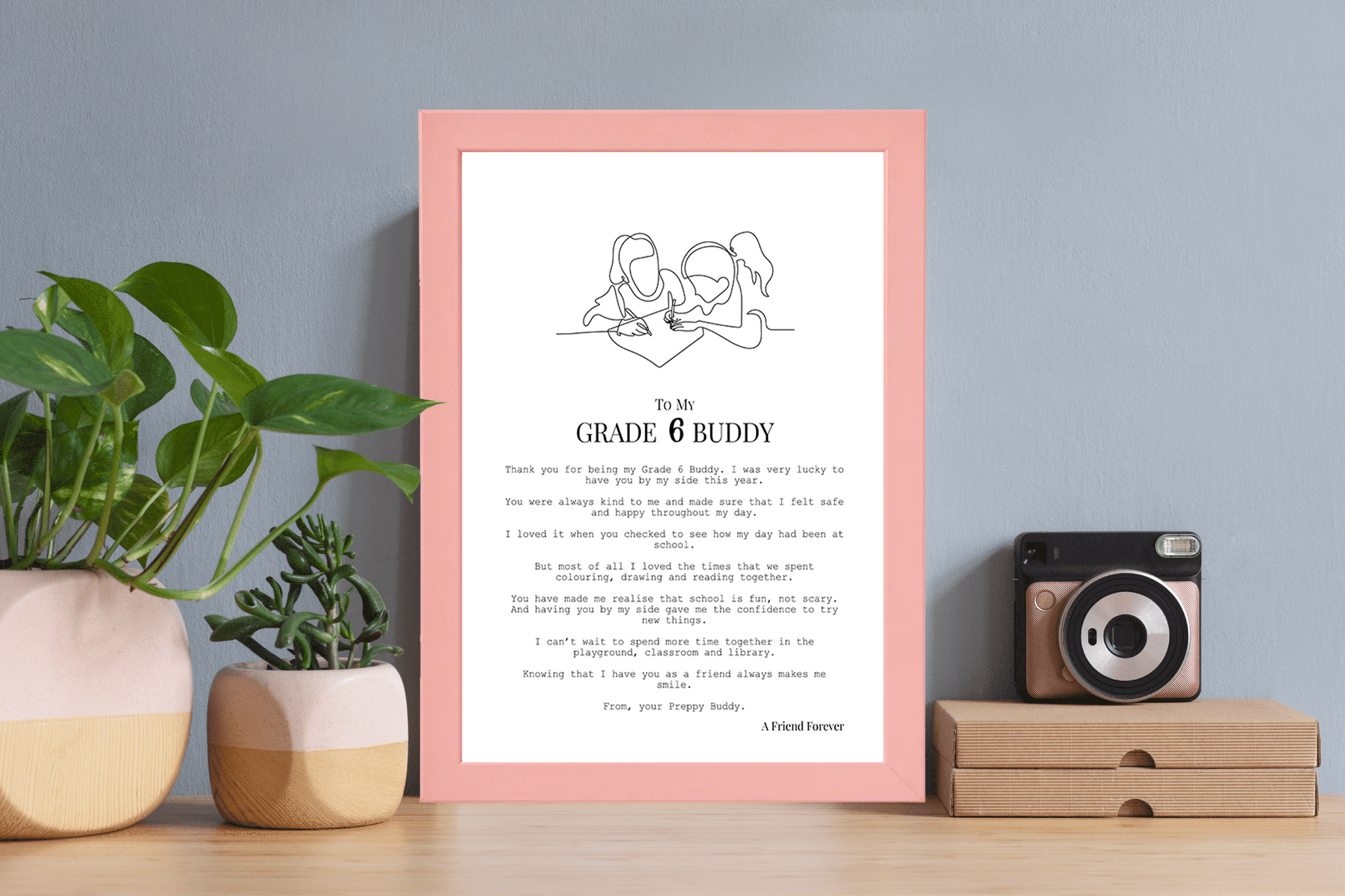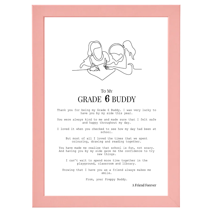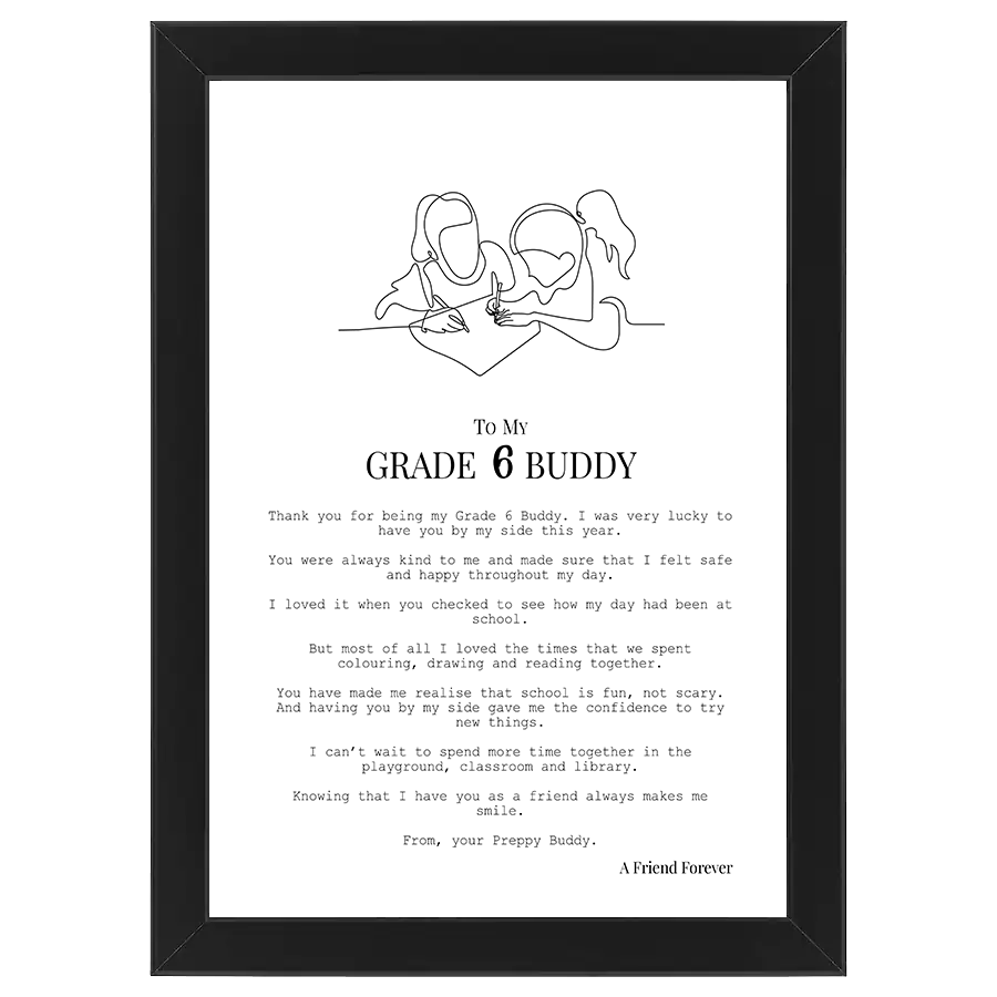 If your little one had a kind, caring, and compassionate grade 6 buddy who worked their hardest each day, our personalised frames are a great way to say thank you. Written from the perspective of your kindergarten-aged student, this gifting idea is something that a grade 6 student can carry with them for years and years to come. It will be a beacon of motivation as they head into high school.